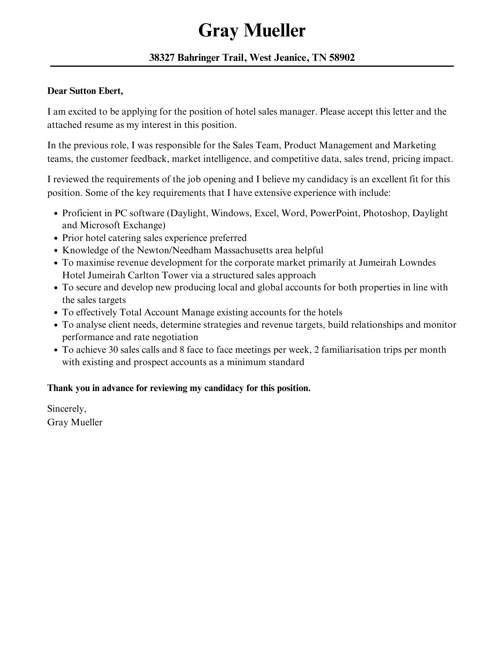 Focus on how you can solve the hotel’s challenges and contribute to its success. Review the job description carefully and identify the key requirements and responsibilities. In your cover letter, address these points directly and provide evidence of your ability to meet them. For example, if the job description mentions a need to increase group sales, explain how you have successfully done so in the past and how you would approach the challenge at this hotel. If the hotel is focused on improving customer satisfaction, highlight your experience in building client relationships and exceeding expectations. Tailor your letter to match the specific needs of the hotel to show you are the right fit for the role.