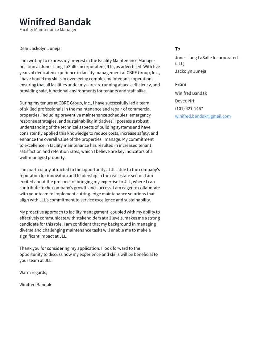 Proper formatting and structure are essential for creating a professional and readable cover letter. Begin by including your contact information at the top of the letter. This should include your name, phone number, email address, and LinkedIn profile (optional). Next, include the date and the hiring manager’s name and title, if available. If you don’t know the hiring manager’s name, use a general salutation like “Dear Hiring Manager.” Avoid generic greetings like “To Whom It May Concern.” Keep the formatting consistent throughout the document. Use a professional font like Arial, Times New Roman, or Calibri, and maintain a font size between 10 and 12 points. Ensure your letter is well-organized, with clear sections and headings. Use bullet points to highlight key skills and achievements, making it easy for the reader to scan the document. A well-formatted cover letter is easy to read and shows your attention to detail, which are important qualities for a facility manager.